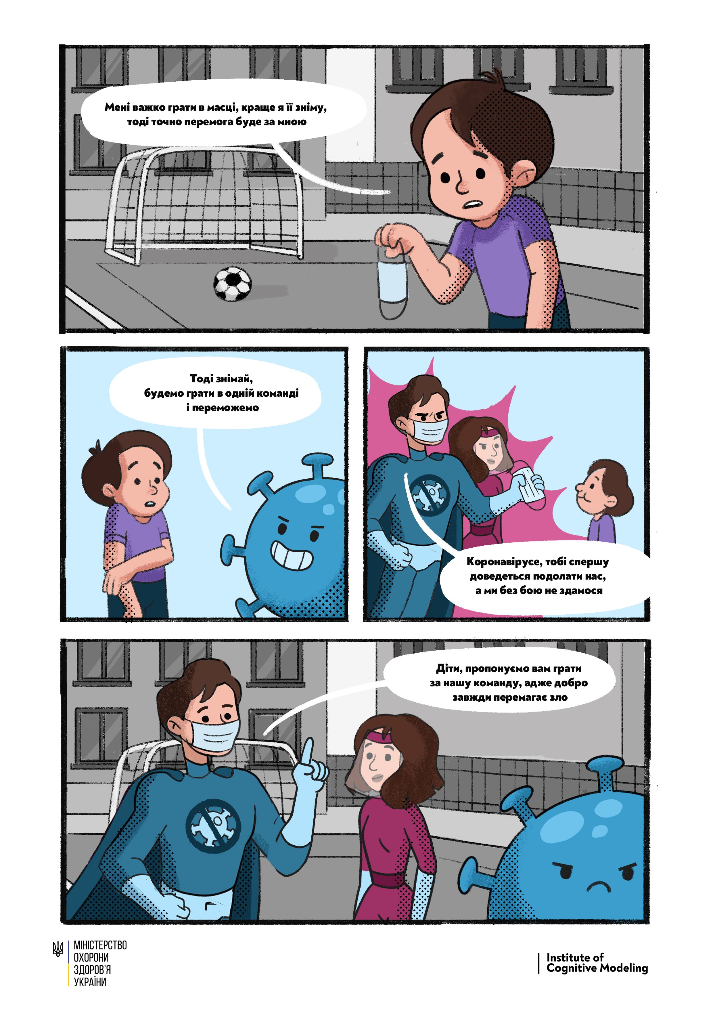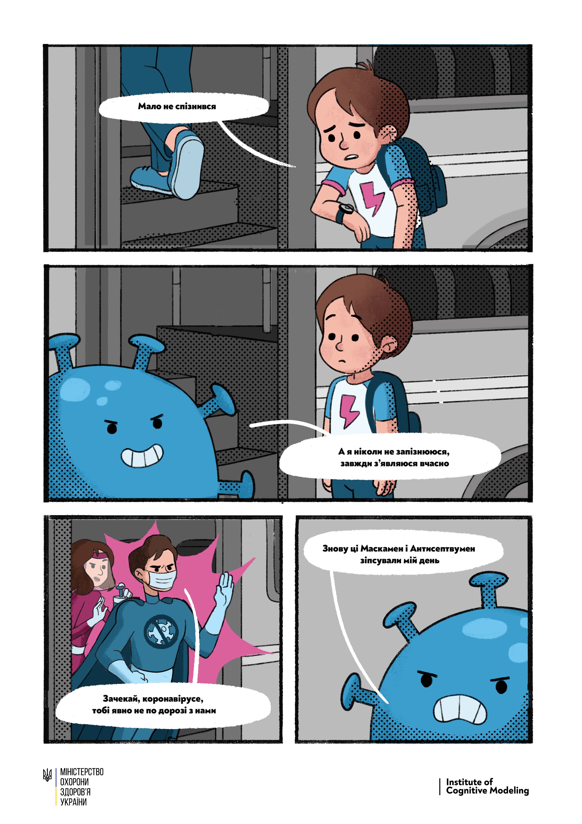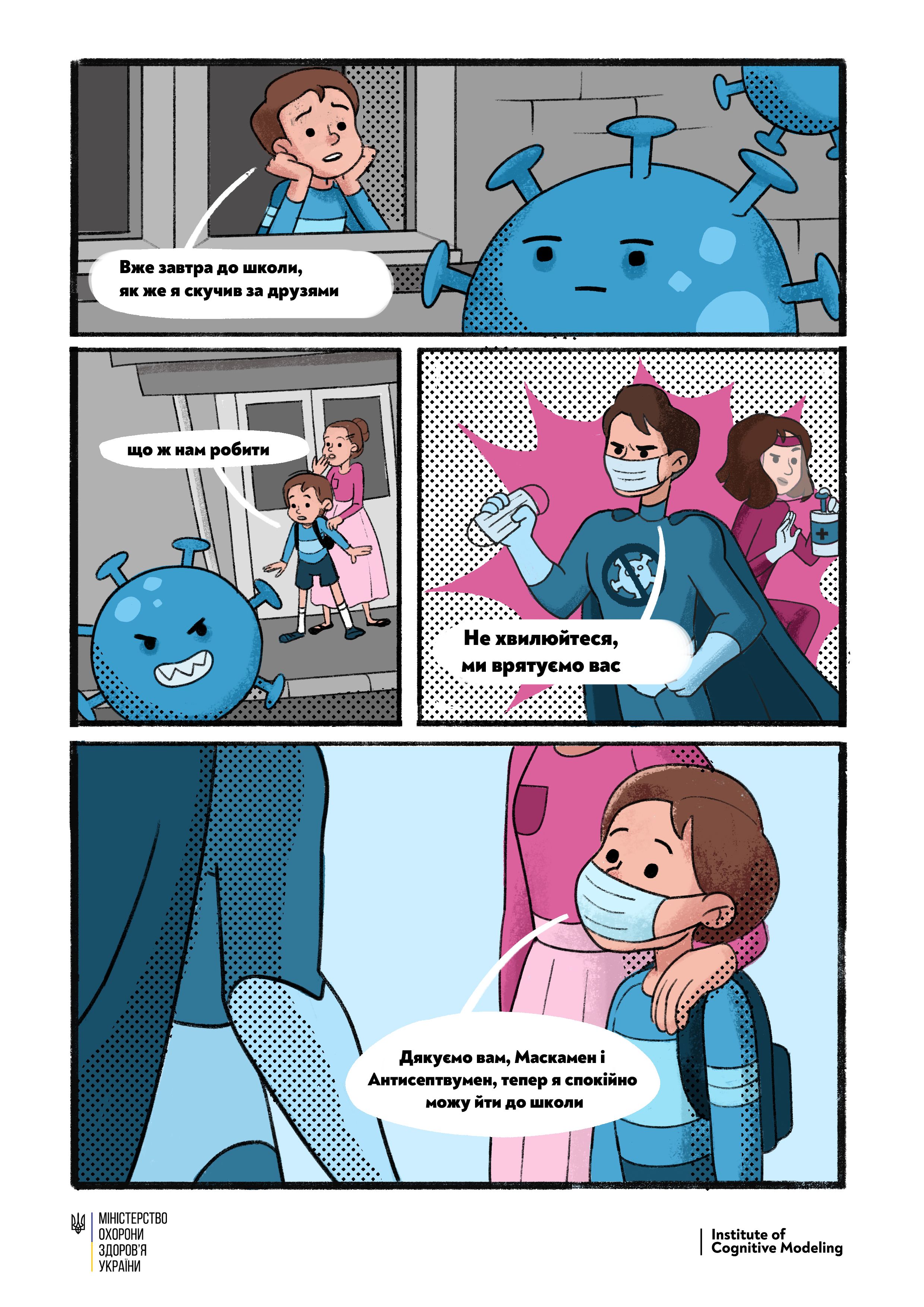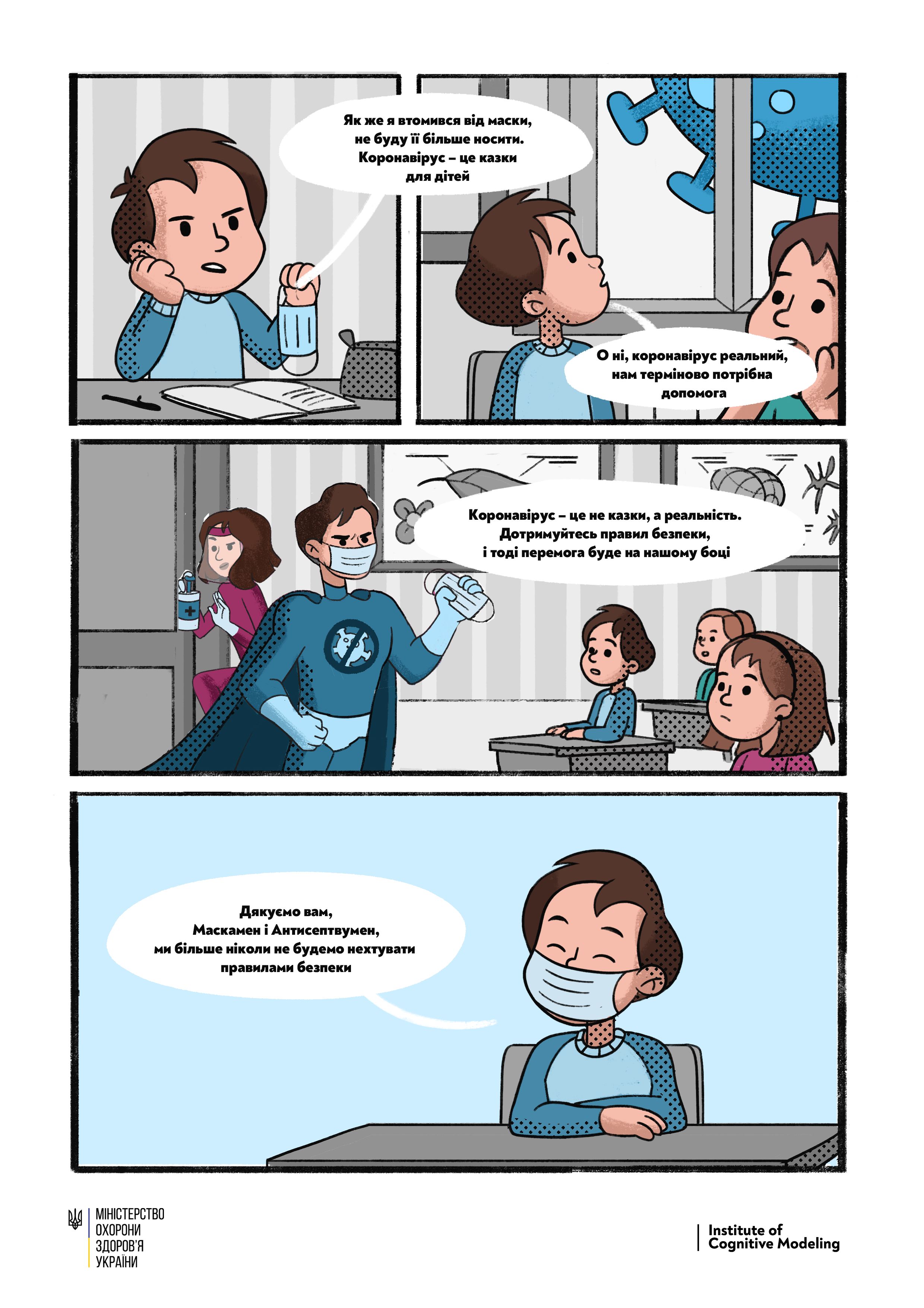 «Міністерство охорони здоров’я разом з Інститутом когнітивного моделювання розробили серію коміксів для школярів. Вони створені в рамках кампанії щодо необхідності носити захисні маски та користуватись антисептиками», – йдеться на сайті МОЗ.