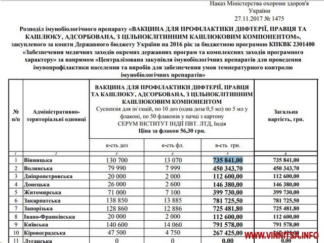 В Міністерстві охорони здоров’я України затвердили розподіл імунобіологічного препарату «вакцина для профілактики дифтерії, правця та кашлюку, адсорбована, з цільноклітинним кашлюковим компонентом», закупленого за кошти Державного бюджету України на 2016 рік.