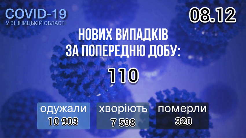 За інформацією Вінницької облдержадміністрації, станом на ранок 8 грудня у Вінницькій області виявили 110 нових випадків захворювання на коронавірус. Внаслідок ускладнень, викликаних хворобою, померли четверо пацієнтів. За добу захворювання виявили в 10 медичних працівників.