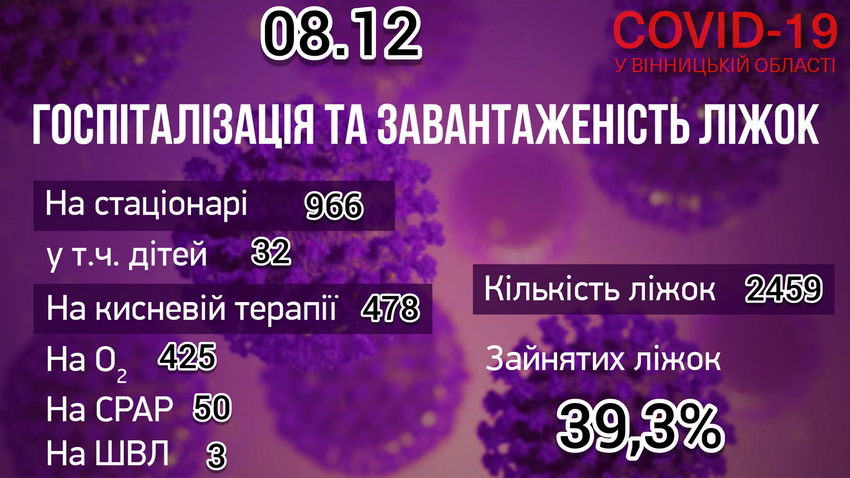 За інформацією Департаменту охорони здоров’я та реабілітації ОДА, в 25 опорних лікарнях області, станом на ранок 8 грудня, на стаціонарі із підтвердженим COVID-19 перебуває 445 дорослих та 5 дітей, з підозрою на коронавірус – 489 дорослих та 27 дітей. На апараті ШВЛ – 3 пацієнта, СРАР – 50, кисень – 425.