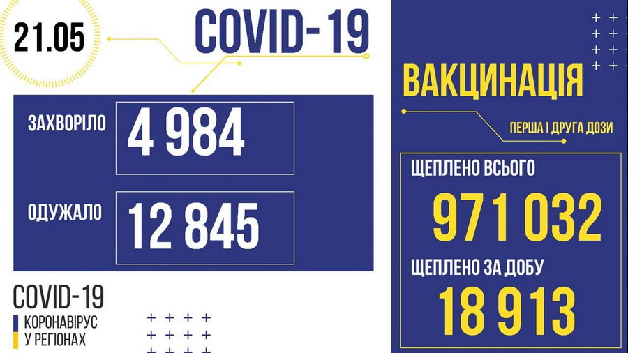 Загалом в Україні за добу одужали 12 845 людини. Захворіли – 4 984. Померли – 202. Щеплено – 6 287 + 12 626 (друга доза), а загалом проведення 971 032 вакцинації.
