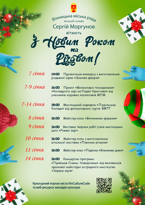 На наступний тиждень новорічно-різдвяних свят для вінничан підготували чимало заходів. Проходитимуть вони усі в онлайн-форматі. Серед них – мистецький марафон «Подільська коляда», різні майстер-класи, концерти і онлайн-проект «Фольклорні посиденьки».