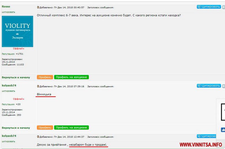 На інтернет-аукціон «Віоліті» виставили на продаж комплекс знахідок 6-7 століття з Вінницької області. Завідувач сектору охорони культурної спадщини управління культури Вінницької ОДА Михайло Потупчик припускає, що це знахідки з пограбованого на Вінниччині кургану.