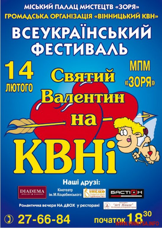 14 лютого у Вінниці проведуть Всеукраїнський фестиваль «Святий Валентин на КВНі». До обласного центру приїдуть гумористи з кількох регіонів.
