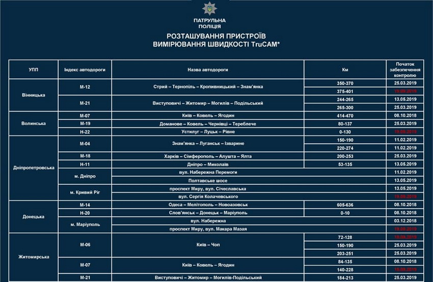 З 19 вересня на дорогах України додається 17 нових та буде розширено 8 існуючих ділянок автодоріг (з підвищеним рівнем аварійності), на яких здійснюватиметься контроль швидкісного режиму за допомогою лазерних вимірювачів швидкості TruCam.