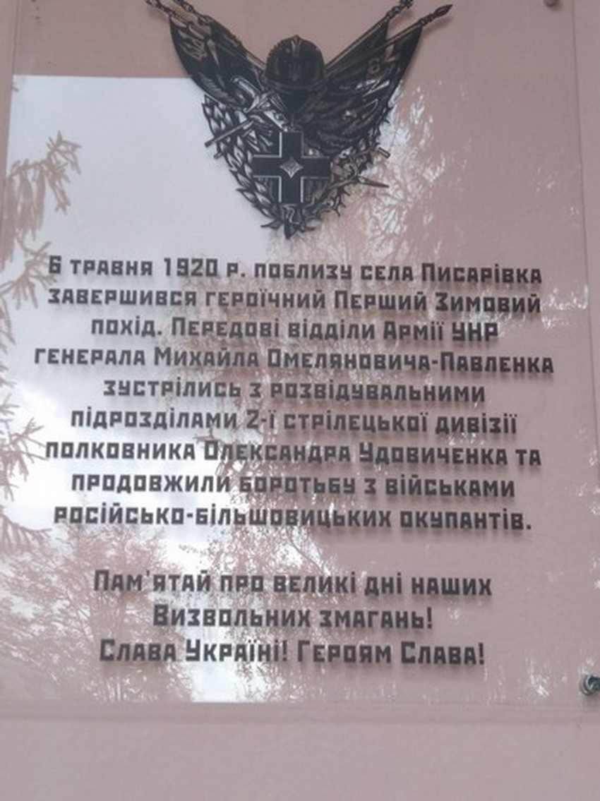 5 листопада на фасаді загальноосвітньої школи в селі Писарівка Ямпільського встановили меморіальну дошку на честь сторіччя завершення Першого Зимового походу Армії УНР.