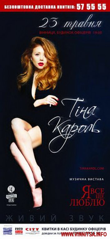 23 травня о 19.00 в Будинку офіцерів найпопулярніша співачка України Тіна Кароль презентує у Вінниці музичну виставу «Я все ще люблю». Пісні, танці й відверті вірші-монологи - у новій сольній програмі вінницькі шанувальники побачать Тіну Кароль такою, якою ще ніколи не бачили!