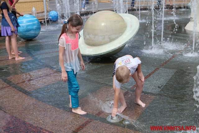 Дорослі фотографуються на фоні скульптури та планет. А дітвора пірнає у облаштованих траншеях, бігає босоніж та обливається водою.