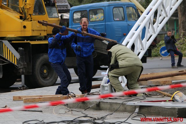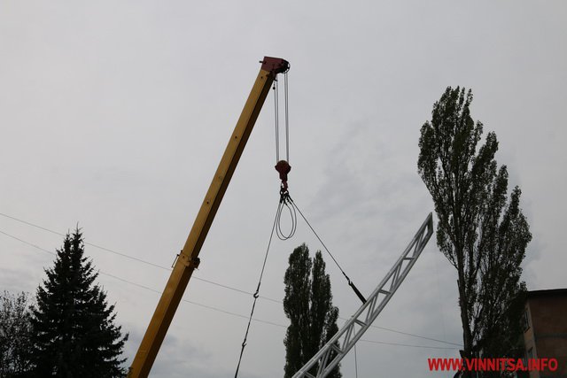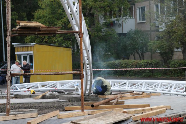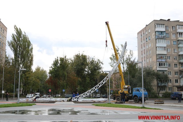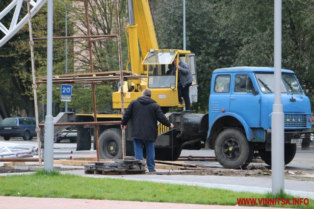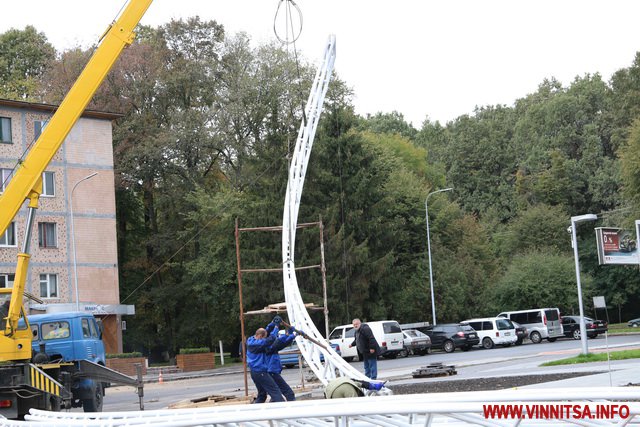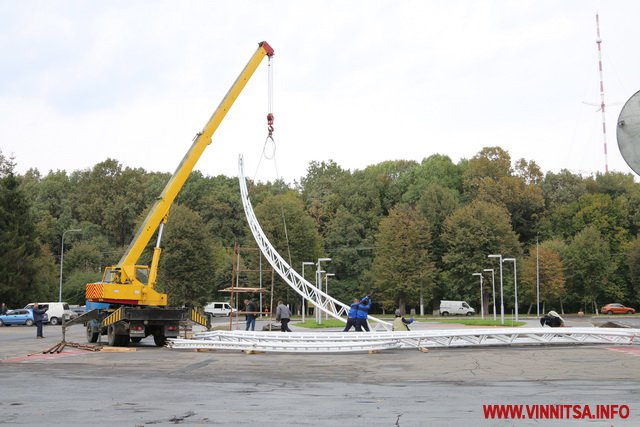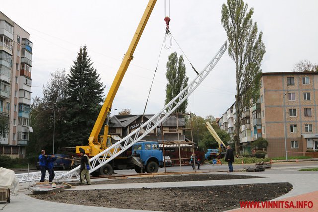 5 жовтня на будівельному майданчику працює спецтехніка та робітники. Вони монтують білі залізні елементи майбутнього постамента.