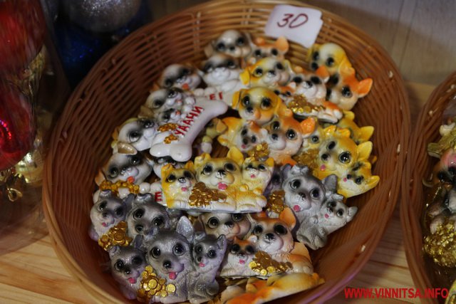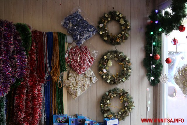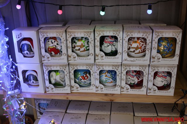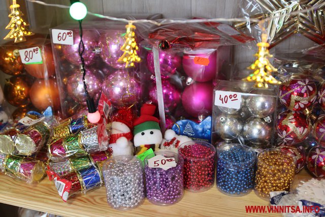 Крім цього тут є великий вибір новорічних іграшок, які розписані вручну. Їх вартість коливається від 60 до 200 гривень. Є в продажу пластикові іграшки в наборах, прикраси на вікна, гірлянди, дощик…