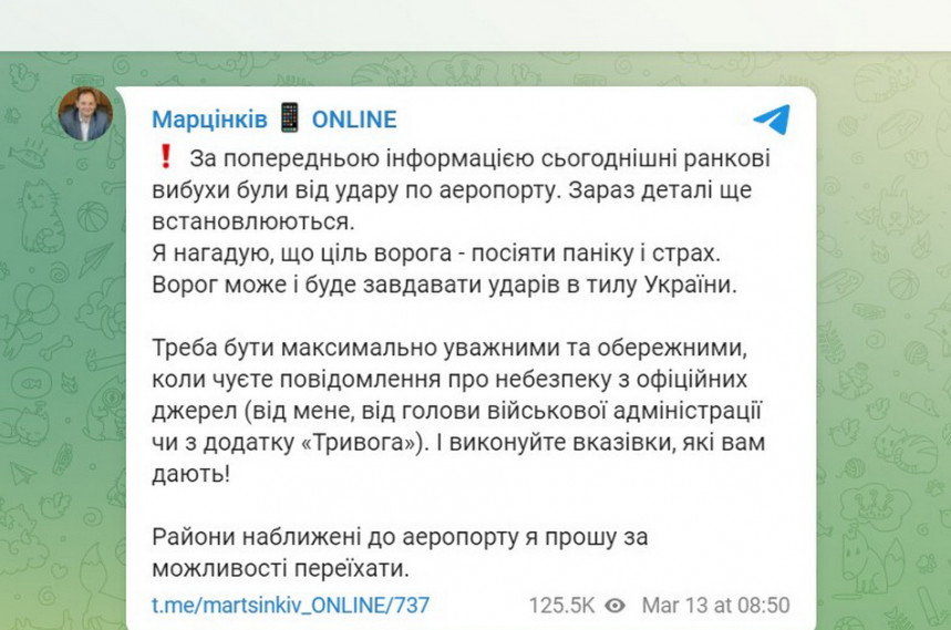 Райони наближені до аеропорту я прошу за можливості переїхати», - пише у своєму телеграмканалі мер міста Руслан Марцінків.