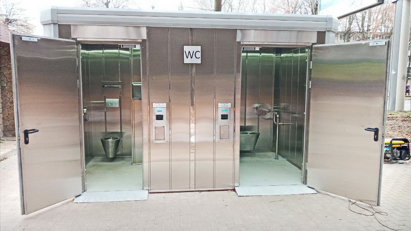 Новий модульний туалет зроблений з нержавіючого металу, тому не псуватиметься від опадів. Стіни утеплені, вбиральня буде опалюватись. Є окрема кабіна для людей з інвалідністю.