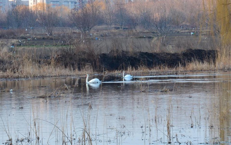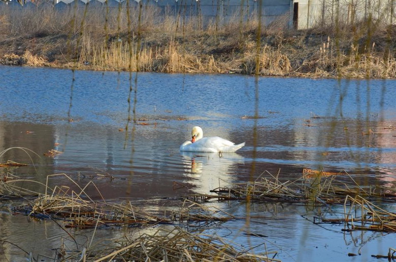 На озері біля АС «Східна» нові мешканці. Нещодавно компанію диким качкам склала пара лебедів. Вони ще не звикли до нового місця, тому їх важко знайти, хіба що серед очерету або на мілководді, подалі від людських очей.