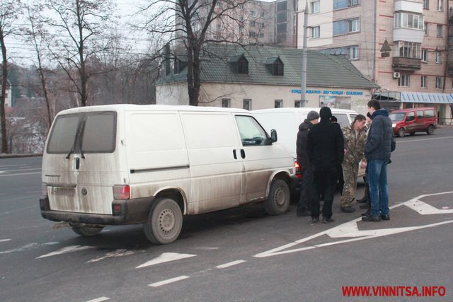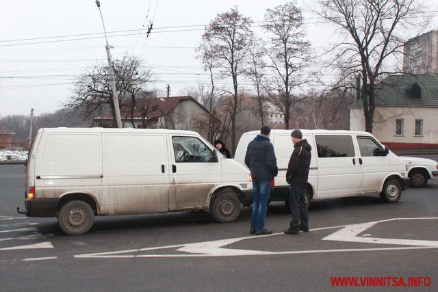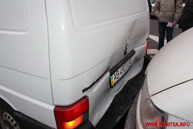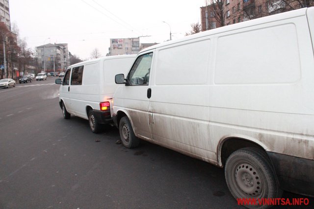 Один автомобіль марки «Volkswagen Transporter» «догнав» іншу автівку такої ж марки і теж білого кольору.