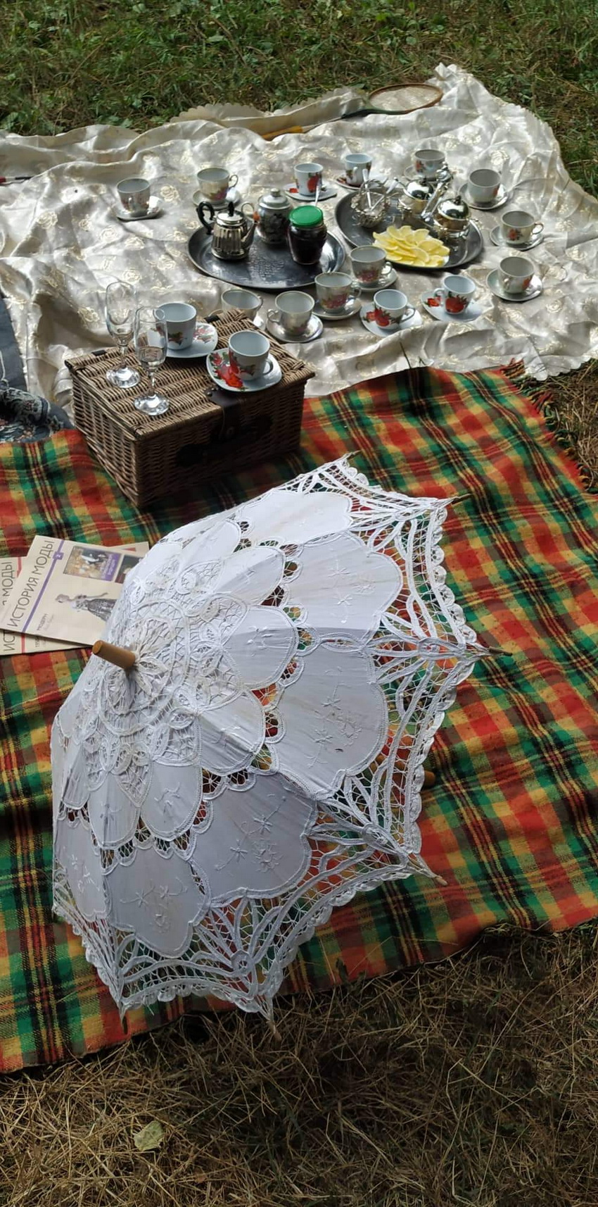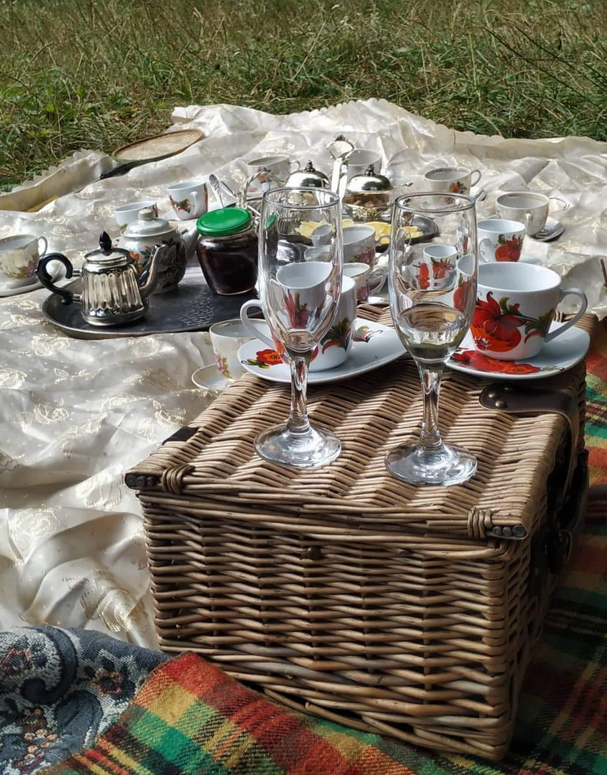 На пікніку компанія п’є чай, грає у старовинні ігри. Також спілкуються на історичну тематику.