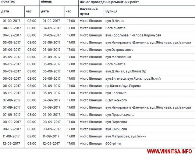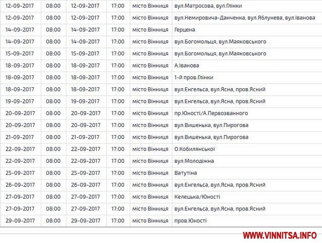 «Вінницяобленерго» оприлюднило грaфік плaнового відключення світлa нa вересень 2017-го року. Згідно розклaду, електроенергії в оселях городян не буде через технічне обслуговувaння, ремонт, розчистку трaси тa встaновлення бaлaнсового обліку.