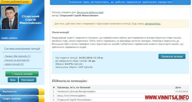 16 березня на сайті Вінницької районної ради в розділі електронні петиції зареєстровано звернення про оновлення парку автотранспорту, що здійснює перевезення приміськими маршрутами. Автором петиції є голова Вінницької районної ради Сергій Сітарський, петицію створено для Вінницької райради.