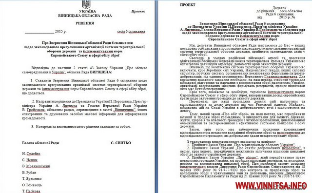 На наступну сесію Вінницької обласної ради, яка має відбутись 23 червня, підготували проект «Звернення Вінницької обласної Ради 6 скликання щодо законодавчого врегулювання організації системи територіальної оборони держави та імплементування норм Європейського Союзу в сфері обігу зброї».