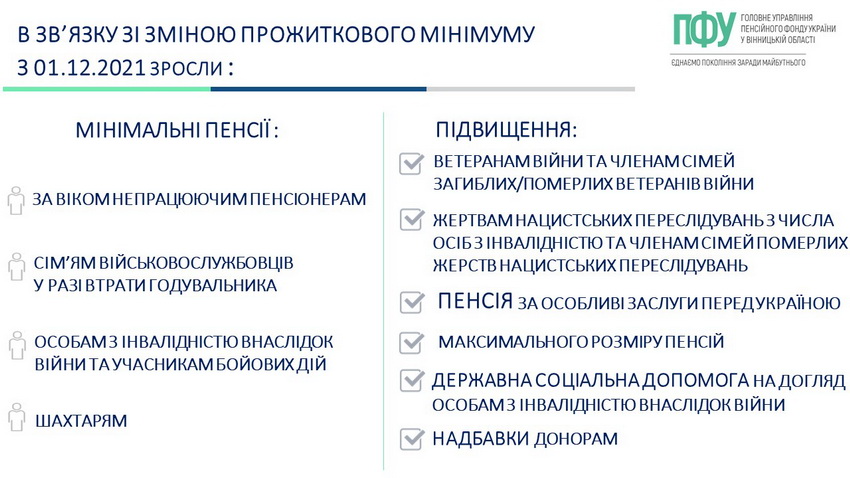 «Прожитковий мінімум і мінімальна заробітна плата – величини, що вплинули на зміну розмірів грудневих пенсій. У зв’язку зі зміною соціальних стандартів Пенсійним фондом області проведено останній, десятий, перерахунок пенсій в поточному році. Пенсіонерам, які мають повний страховий стаж, збільшено розмір мінімальної пенсії за віком до 1934 грн, розміри надбавок, підвищень до пенсій, які визначаються, виходячи з розміру прожиткового мінімуму для осіб, які втратили працездатність. Таке підвищення отримали 178,6 тис. пенсіонерів Вінниччини, або 40,5% від їх загальної кількості. Середній розмір підвищення склав 57,69 грн.