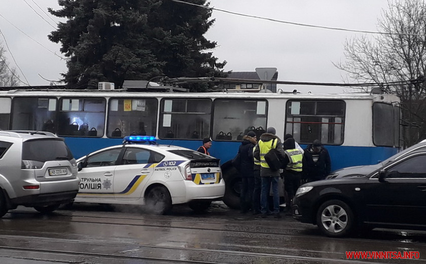 У позашляховика пошкоджений капот. На місці події працюють патрульні поліцейські, представники «Вінницької транспортної компанії» та страхової.