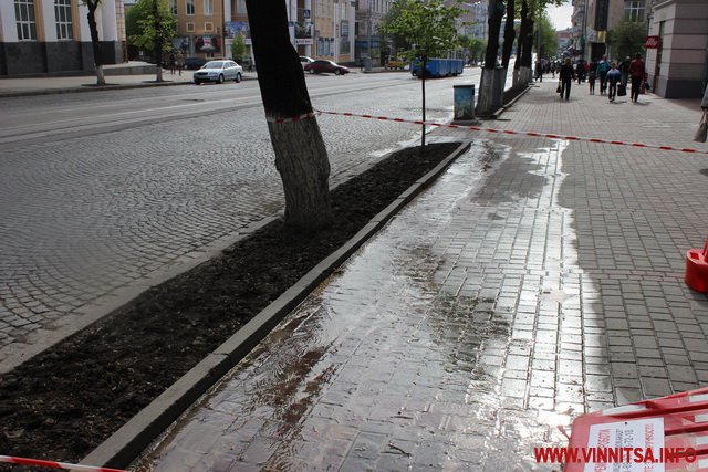 18 квітня у Вінниці на вул. Соборній внаслідок прориву водопровідної труби стався провал тротуарної плитки та люка.