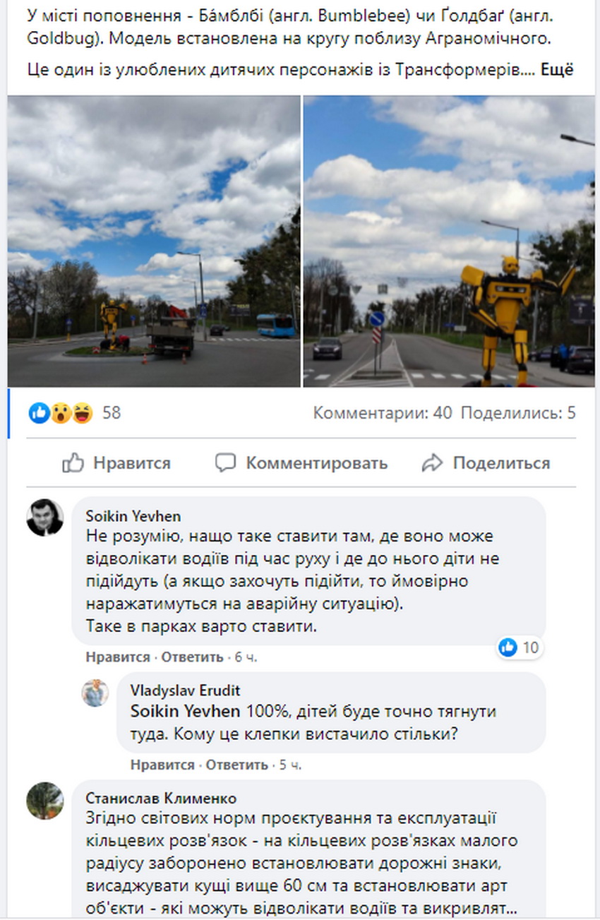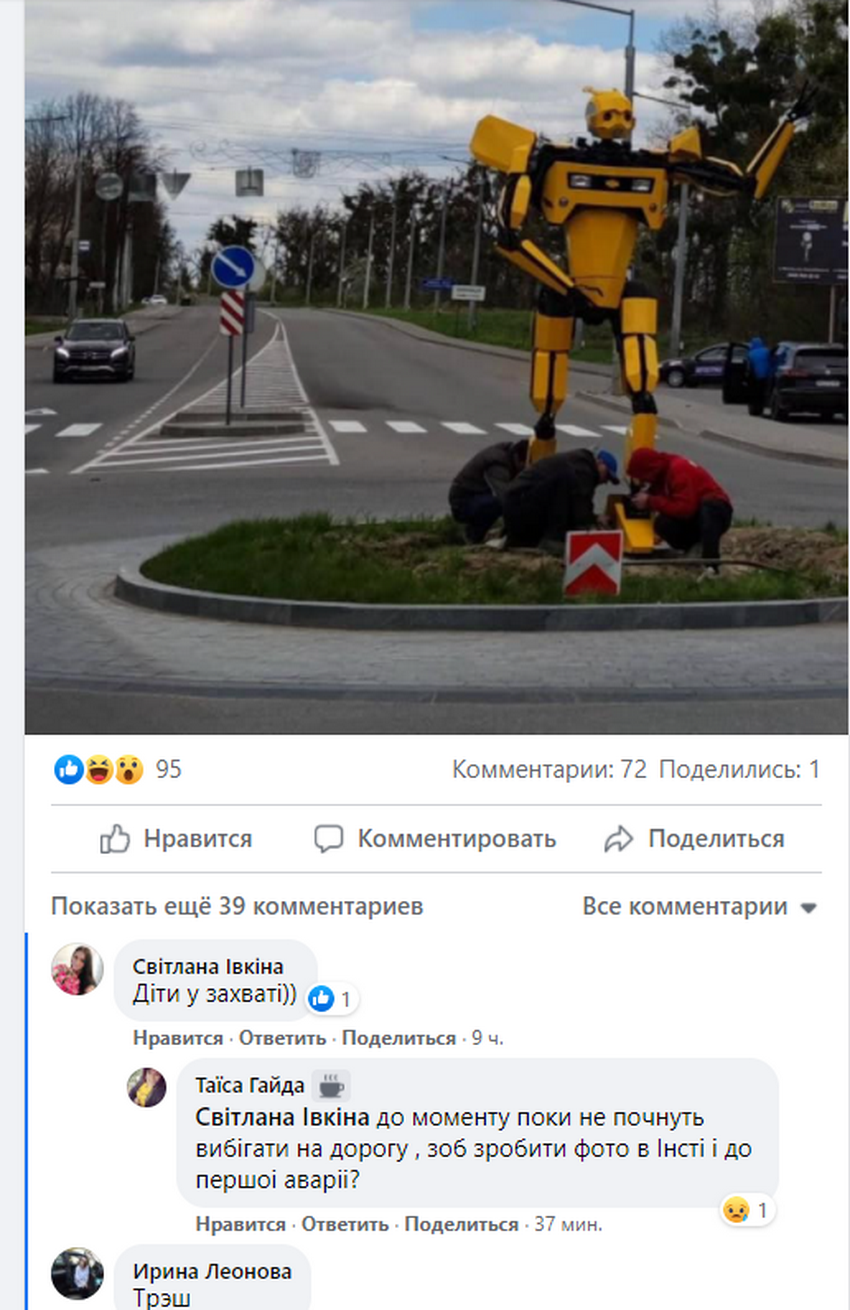 «Не розумію, нащо таке ставити там, де воно може відволікати водіїв під час руху і де до нього діти не підійдуть (а якщо захочуть підійти, то ймовірно наражатимуться на аварійну ситуацію). Таке в парках варто ставити», - прокоментував Євген Сойкін.