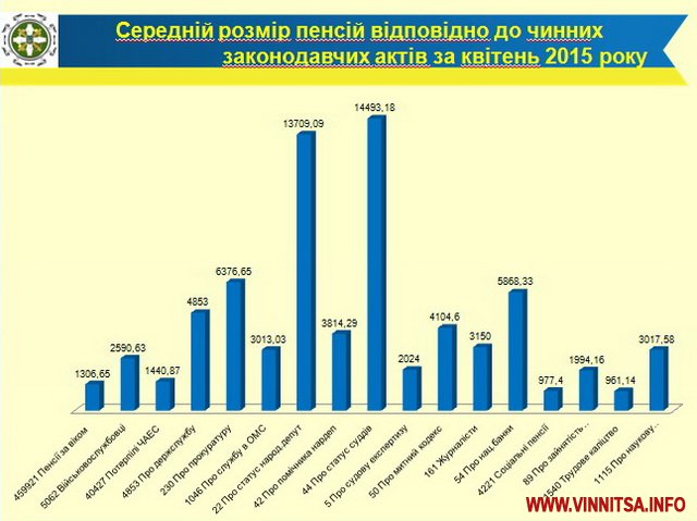 За квітень 2015 року 459,9 тис. вінничанам виплачено пенсій за віком – середній розмір їх пенсій склав 1306 гривень. Найвищі пенсії у квітні отримали 44 судді, середній розмір їх пенсій склав 14,4 тис. гривень.