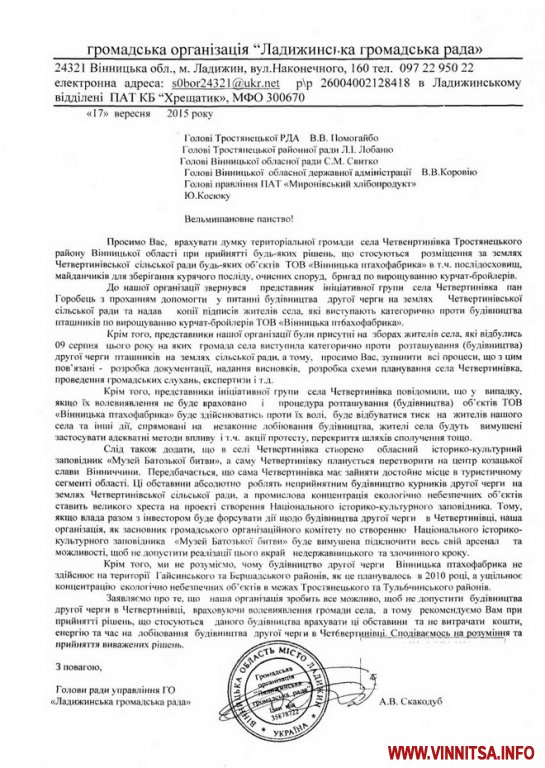 Мешканці села також направили колективне звернення за підписами 779-ти громадян на ім’я голови Вінницької обласної Ради Сергія Свитка, голові Вінницької ОДА Валерію Коровію, голові правління ПАТ «Миронівський хлібопродукт» Юрію Косюку та керівництву Тростянецької районної влади. Вінничани просять недопустити будівництва, майданчиків для зберігання курячого посліду, очисних споруд, будівель для вирощування курчат-бройлерів тощо.