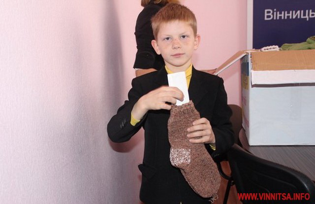 Виготовлені дітьми вироби будуть передані бійцям дев’ятого вінницького батальйону територіальної оборони, які нині знаходяться у зоні проведення антитерористичної операції на сході країни. У кожну пару шкарпеток діти Вінниччини вложили для бійців ще й маленькі обереги: ангелочки, ляльки-мотанки, сплетені власноруч жовто-блакитні стрічки.