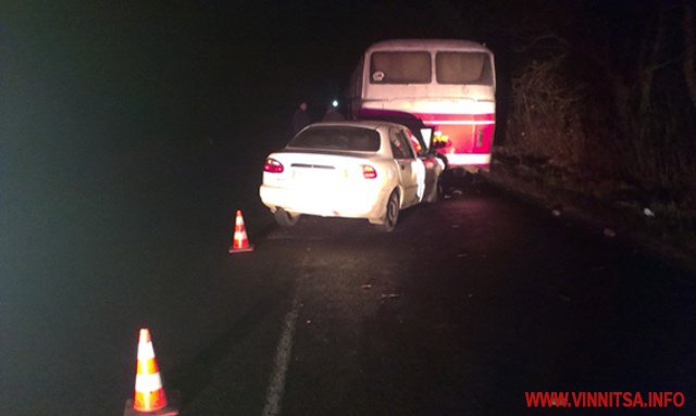 Попередньо встановлено, що зламаний вночі на дорозі автобус, водій огородив гіллям. В цей час 37-річний житель м. Бершадь, рухаючись на «Даеwоо Ланос» по цій самій смузі, де стояв автобус, об’їжджаючи гілля, та будучи засліплений світлом фар зустрічних машин, не побачив транспортний засіб та зіткнувся з ним.