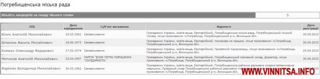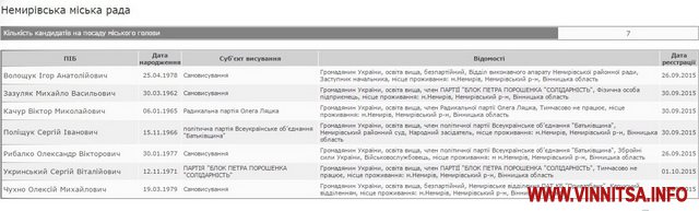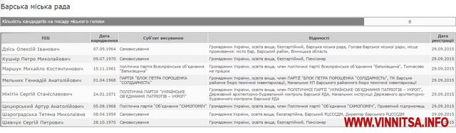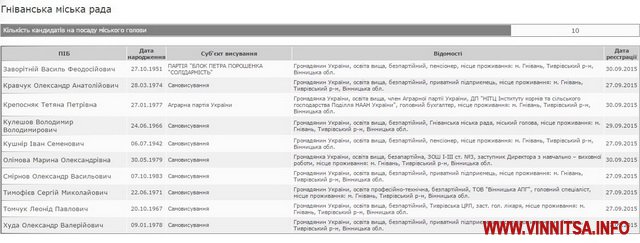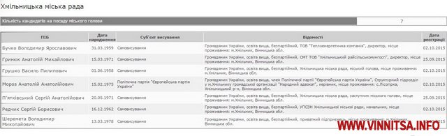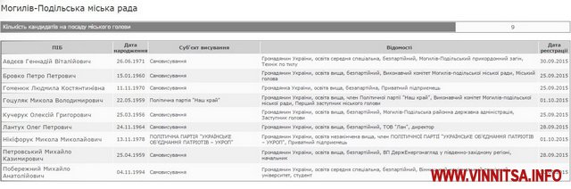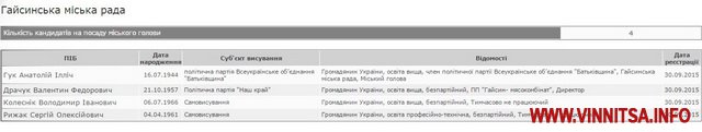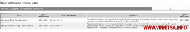 Як відомо, на посаду Вінницького міського голови зареєструвалось 12 кандидатів, також 12 кандидатів зареєструвались в мери м. Ямпіль. Найменше претендентів – на мера м. Шаргород – зареєстровано всього 2 кандидати.