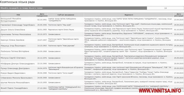У Вінницькій області найбільше кандидатів зареєструвалося на посаду мера міста Козятин – 14 осіб. Найменше бажаючих очолити Шаргородську міськраду – лише двоє. Один з них чинний мер, інший – працівник апарату облради.