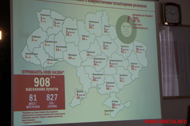 «Вимоги закону «Про засудження комуністичного та націонал-соціалістичного (нацистського) тоталітарних режимів в Україні і заборона пропаганди їх символіки» досить жорсткі і вразі неприйняття відповідних рішень місцевими органами влади до 21 листопада щодо перейменування назв вулиць і населених пунктів, ці функції зобов’язана буде зробити облдержадміністрація.