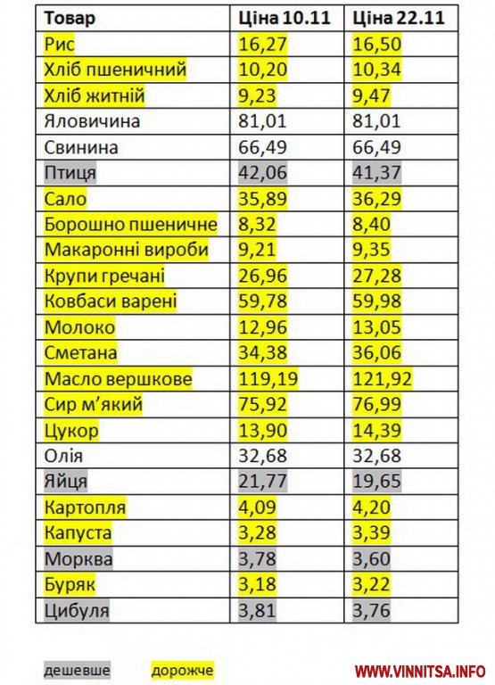За останні 10 днів на Вінниччині подорожчали практично всі товари. За інформацією Державної служби статистики України, вже третій тиждень поспіль найбільше зростає в ціні масло – цього разу із 119,19 гривень до 121,92 гривень за кілограм. В листопада почав дорожчати і хліб: житній і пшеничний з нову прибавив по 20 копійок.
