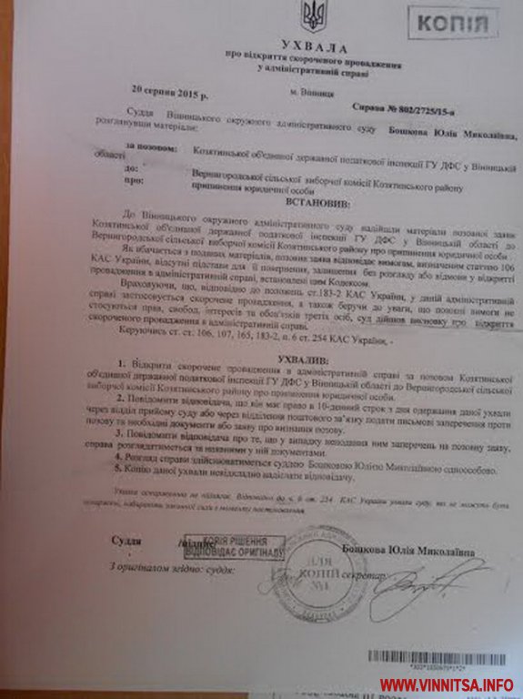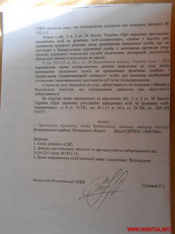 8 вересня на сторінці ГО «Суспільні ініціативи Козятинщини» в соцмережі «ВКонтакте» було опубліковано копії судових документів, з яких випливає, що місцева податкова інспекція ініціювала припинення статусу юридичних осіб Вернигородської, Миколаївської та Білопільської сільських виборчих комісій Козятинського району Вінницької області.