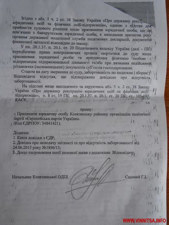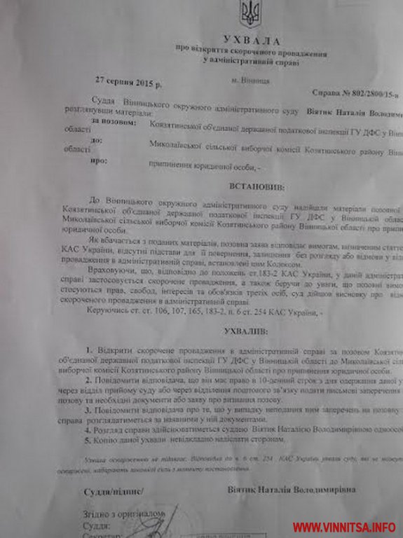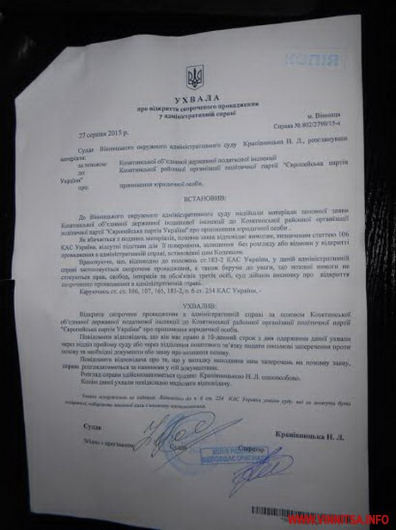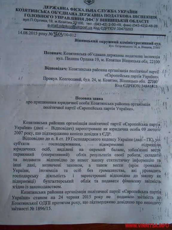 Серед опублікованих документів є і копія аналогічного позову Козятинської ОДПІ до районної організації політичної партії «Європейська партія України» та копії ухвал Вінницького окружного адмінсуду про відкриття проваджень за скороченою процедурою.