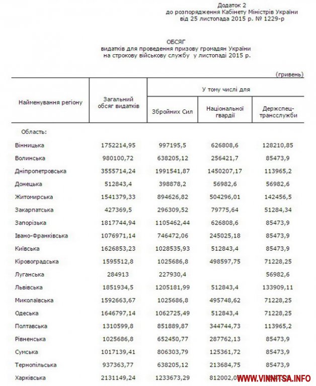 Окрім того, розпорядженням передбачено обсяг видатків для проведення призову громадян України. Для Вінницької області загальний обсяг видатків становить 1752214,95 гривень.