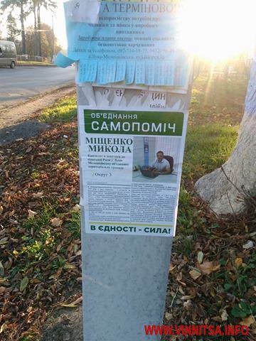 Крім того, у селі Лука-Мелешківська спостерігач ОПОРИ виявив друковані матеріали з агітацією за кандидата на посаду сільського голови Андрія Сокура (самовисування) та кандидата на посаду депутата від Всеукраїнського об’єднання «Самопоміч» Миколу Міщенка у не призначених для цього місцях: на електроопорах та на прилавку в магазині.