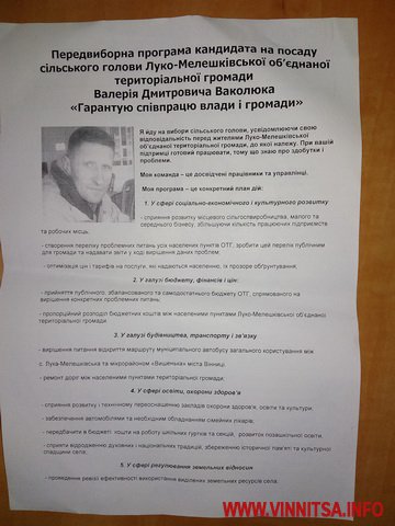 Так, зокрема, у Лука-Мелешківській об’єднаній територіальній громаді розповсюджують передвиборні програми кандидата на посаду сільського голови Валерія Ваколюка (самовисування), які не містять вихідних даних.