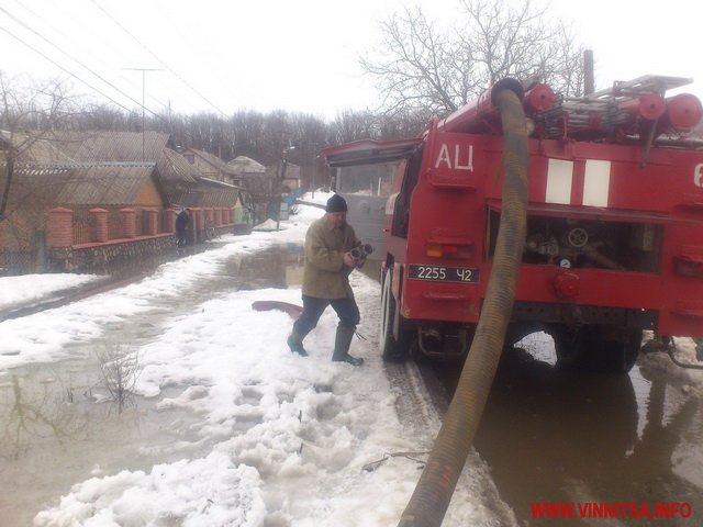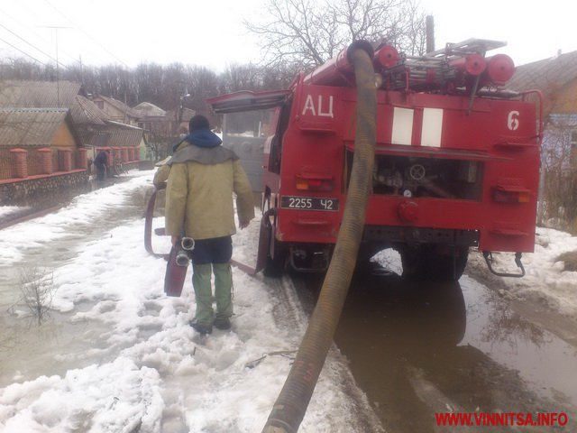 О 10:52 до Служби порятунку «101» надійшло повідомлення від директора КП «Гнівань водопостач» з проханням надання допомогу шляхом залучення спецтехніки для відкачування талої води, яка загрожує підтопленню приватних дворів по вулиці 1-Травня у м. Гнівань. Прибувши на місце виклику, рятувальники провели роботу по відкачуванню 30 куб.м. талої води.