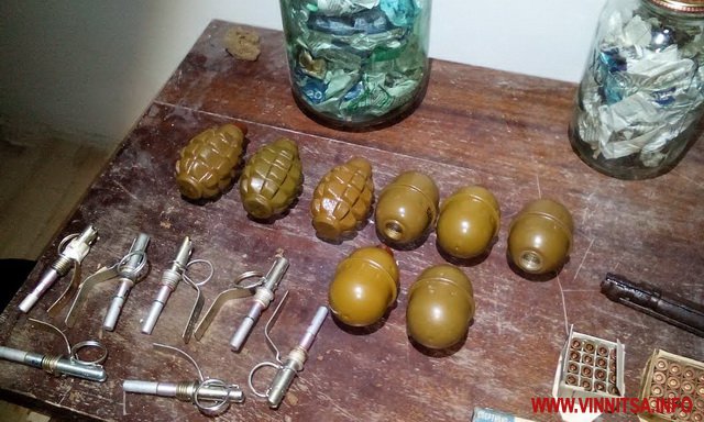 У смт Тиврів Вінницької області Служба безпеки України викрила схованку з гранатами та набоями. Співробітники спецслужби встановили, що боєприпаси належать місцевому мешканцю, засудженому чотири рази за розбій, нанесення важких тілесних ушкоджень та пограбування. Засоби ураження чоловік зберігав з метою продажу.