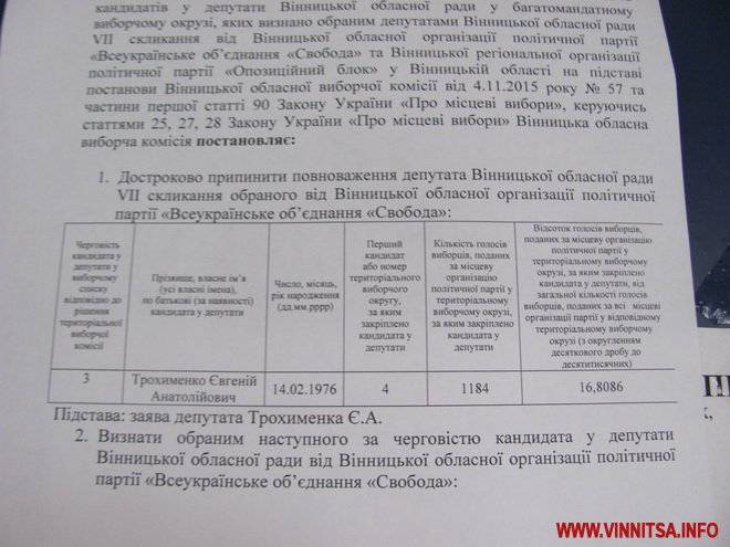 Варто зазначити, що Трохименко представляв політсилу «Свобода» і до облради пройшов від 4 територіального виборчого округу з 16 123 виборців (Бершадська міська рада, Баланівська, Бирлівська, П’ятківська сількі ради, Бершадська окружна лікарня інтенсивного лікування).
