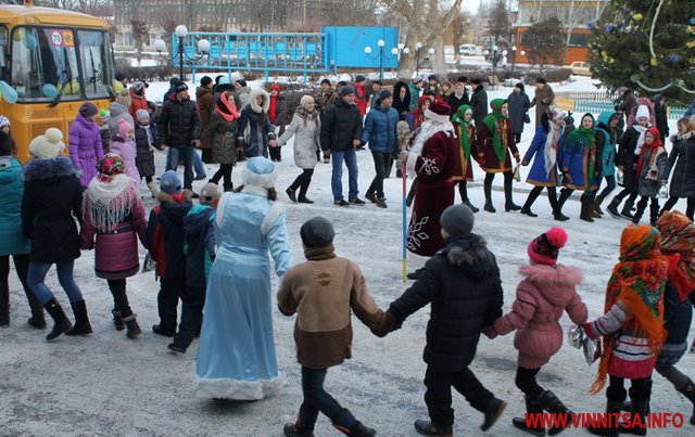 Святковий настрій учасникам зібрання створювали колядками та щедрівками вихованці Центру дитячої та юнацької творчості, солісти районного будинку культури. Також Дід Мороз та Снігуронька водили зі школярами святкові хороводи, проводили конкурси із розіграшем призів та подарунків.