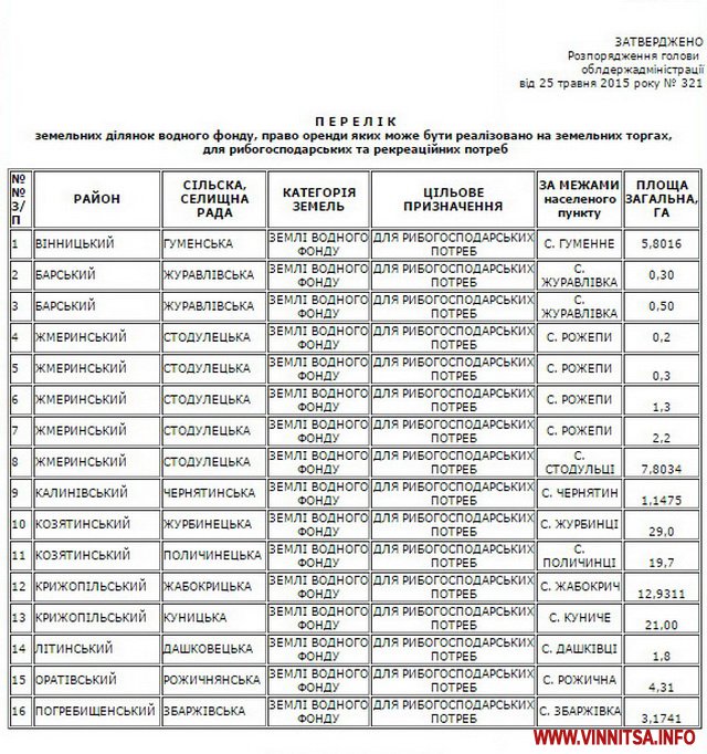 25 травня Голова Вінницької облдержадміністрації підписав Розпорядження «Про затвердження переліку земельних ділянок водного фонду разом з водними об’єктами, право оренди яких може бути реалізовано на земельних торгах, для рибогосподарських та рекреаційних потреб».