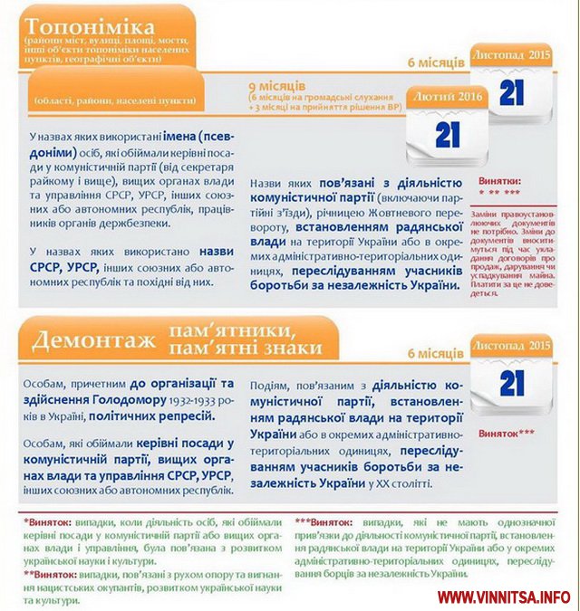 На перейменування населених пунктів, законодавством відведено 9 місяців (6 місяців на громадські слухання і 3 місяці на прийняття Верховною радою). Тобто, до 21 листопада, у день коли Україна відзначатиме День Гідності, країна остаточно розпрощається з символами комуністичного минулого.