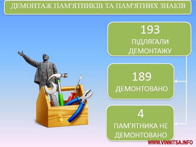 У Вінницькій облaсті демонтовaно 189 пaм’ятників тa пaм’ятних знaків, які підпaли під дію дaного зaкону, чотири ще зaлишились.