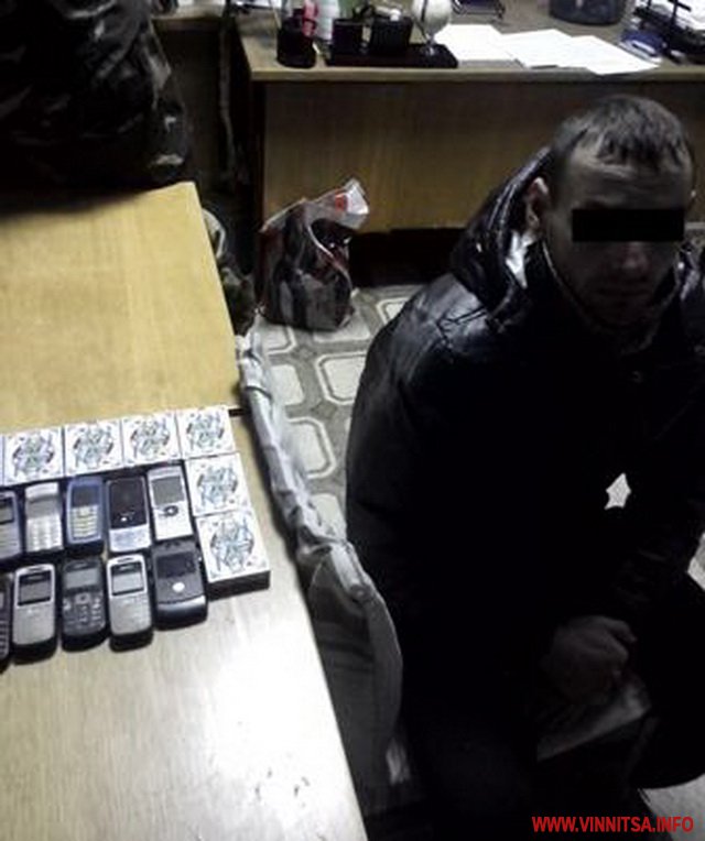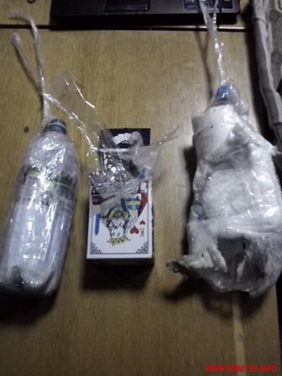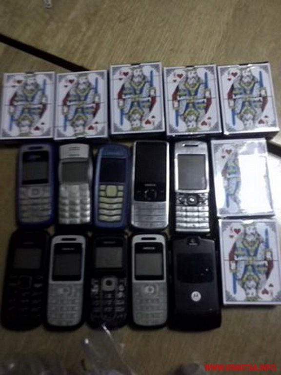 Під час огляду пакунків, які були примотані клейкою лентою до дерев’яних палок, було виявлено чималу кількість заборонених предметів, а саме: 10 мобільних телефонів, 7 колод гральних карт заводського виготовлення та 1,5 літра спиртовмістимої речовини.