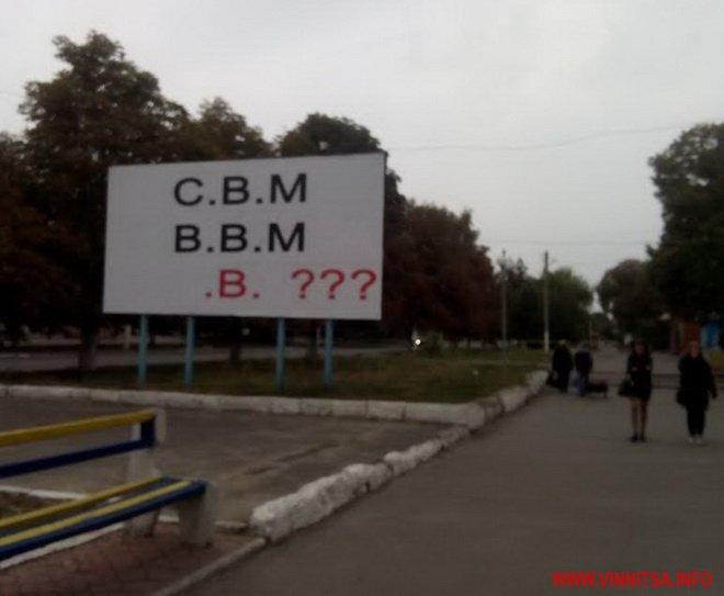 Дивні білборди встановив хтось нещодавно в місті Тульчин Вінницької області. Їхній «меседж» складається лише з семи літер з крапками та трьох знаків питання: «С. В. М./В. В. М./ В. ???».
