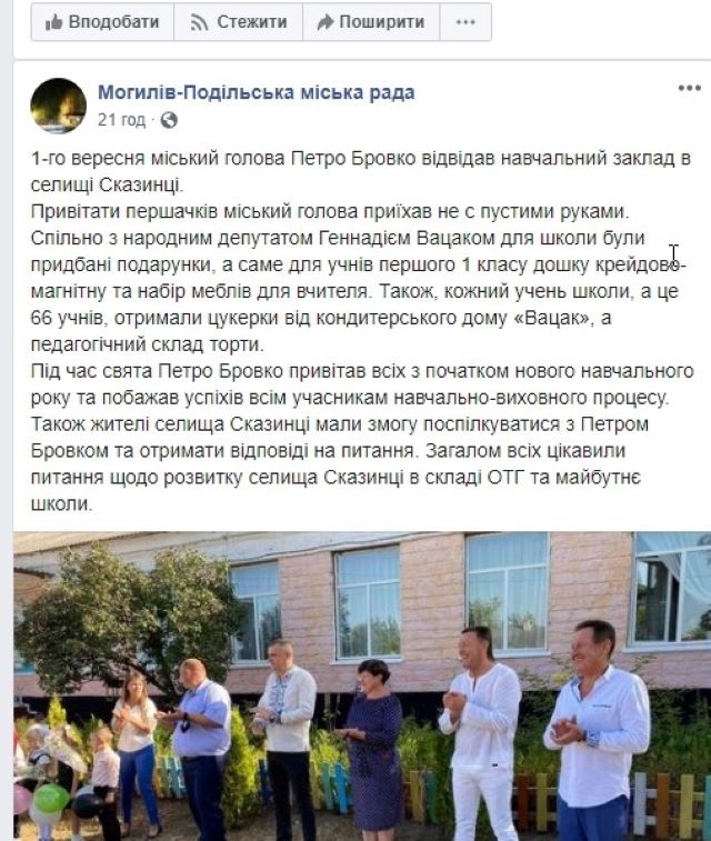 На фейсбук-сторінці «Могилів-Подільська міська рада» опубліковано повідомлення про те, що 1 вересня міський голова Петро Бровко відвідав навчальний заклад в селищі Сказинці та привіз подарунки, куплені спільно з народним депутатом Геннадієм Вацаком (виборчий округ №16, самовисування).