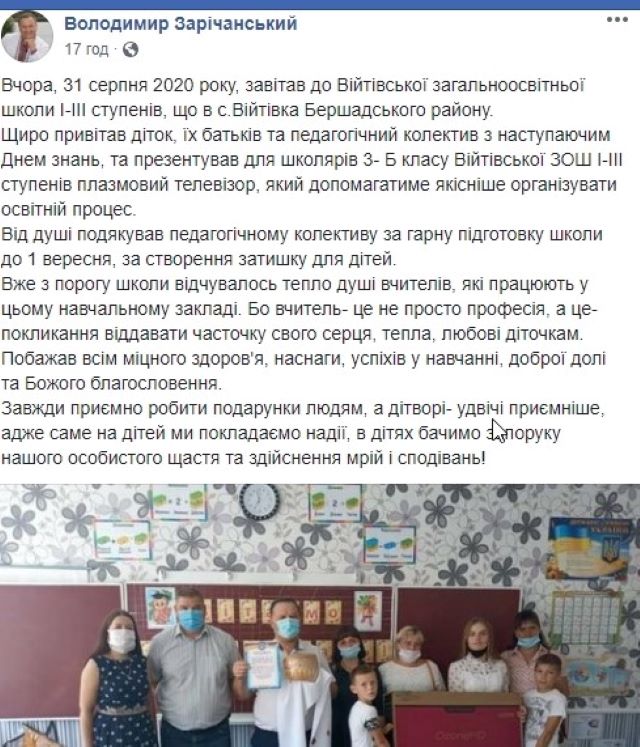 Депутат Вінницької обласної ради Володимир Зарічанський у перший день навчального року на своїй фейсбук-сторінці розмістив допис про те, що він 31 серпня «завітав до Війтівської загальноосвітньої школи І-ІІІ ступенів, що в с. Війтівка Бершадського району. Щиро привітав діток, їх батьків та педагогічний колектив з наступаючим Днем знань, та презентував для школярів 3- Б класу Війтівської ЗОШ І-ІІІ ступенів плазмовий телевізор, який допомагатиме якісніше організувати освітній процес».